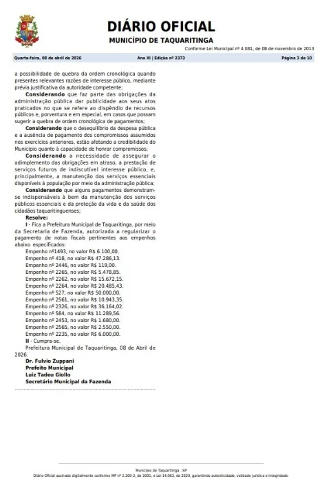 Tornou-se rotina no Diário Oficial de Taquaritinga (SP): praticamente todos os dias, a Prefeitura Municipal publica um “Termo de Justificativa de Quebra da Ordem Cronológica de Pagamentos”. A repetição diária do mesmo documento levanta questionamentos sobre a gestão financeira da cidade e expõe um quadro de desequilíbrio orçamentário.